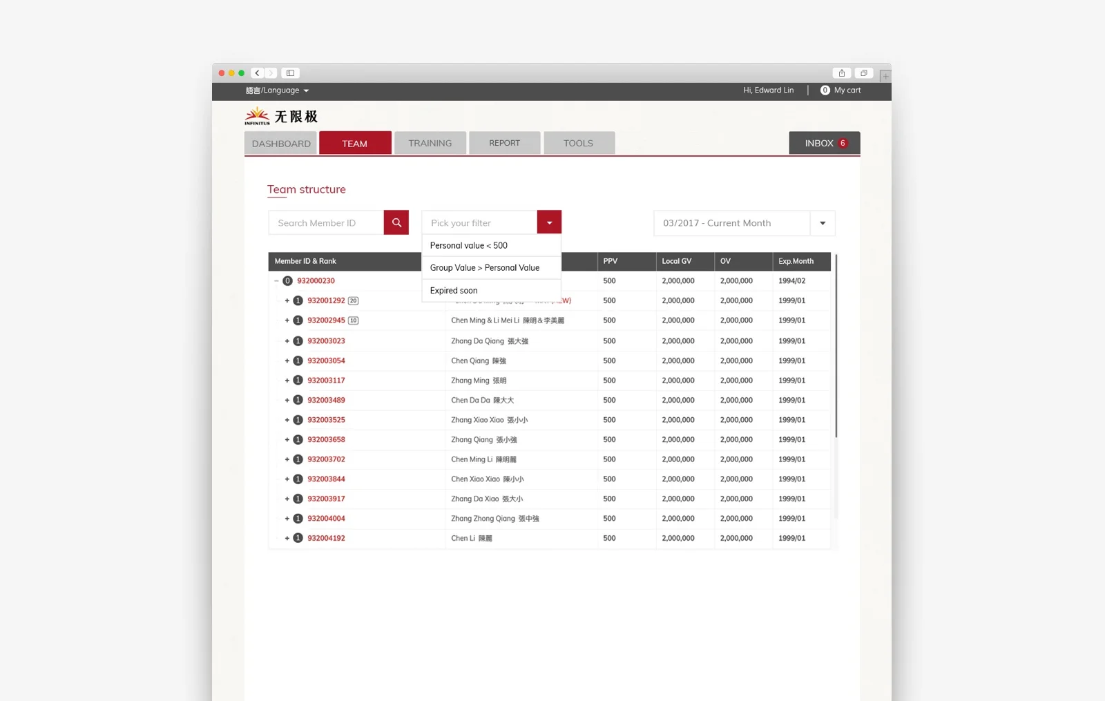 With the search and filter, distributors do not need to browse their members one by one; they can search by their ID or get a filtered list(i.e. PV<500, GV>PV, Expired members) at ease.