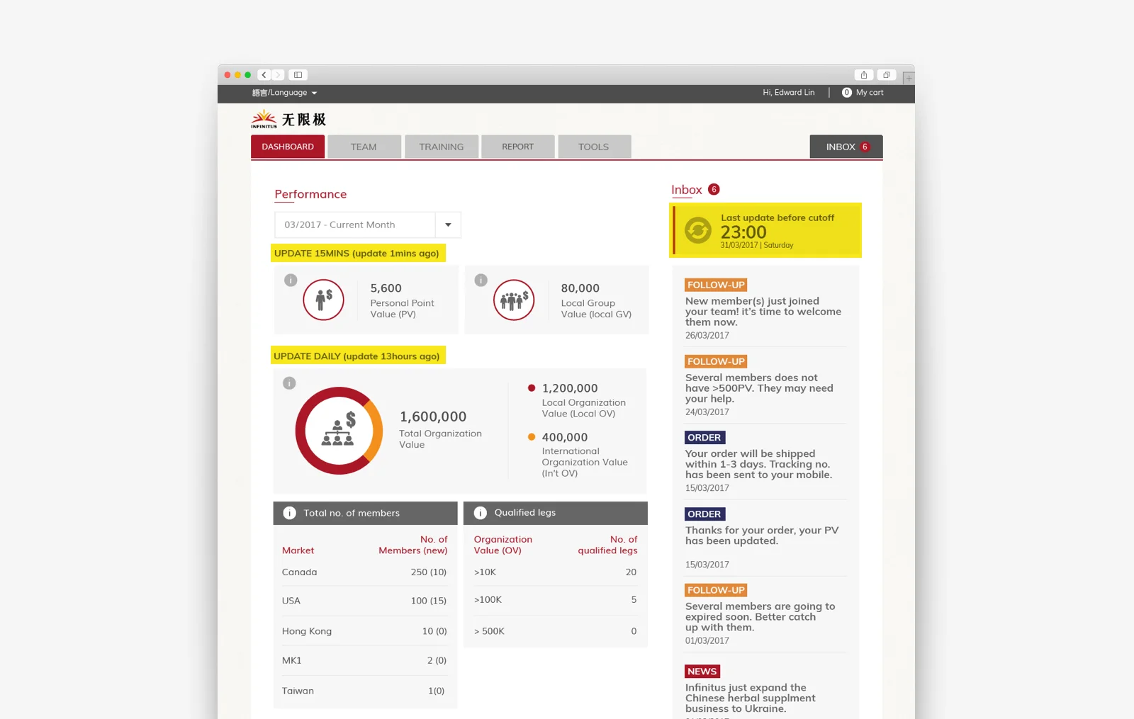 Distributors should focus more on getting new potential business partners, expanding their team via training. With the notifications, they can save a lot of time browsing the dashboard and calling the customer service. Notifications on ordering will inform them their transactions are successful and their personal value is updated. Notifications on monthly follow-up will save their time checking their members from the team performance.