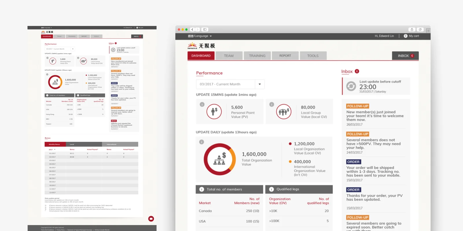 As Lead Designer, I collaborated with cross-functional teams to redesign the business platform for senior distributors, enabling them to efficiently manage their teams and focus on offline training and team expansion.